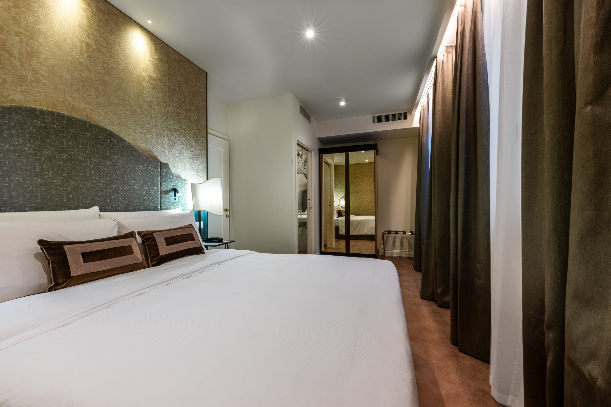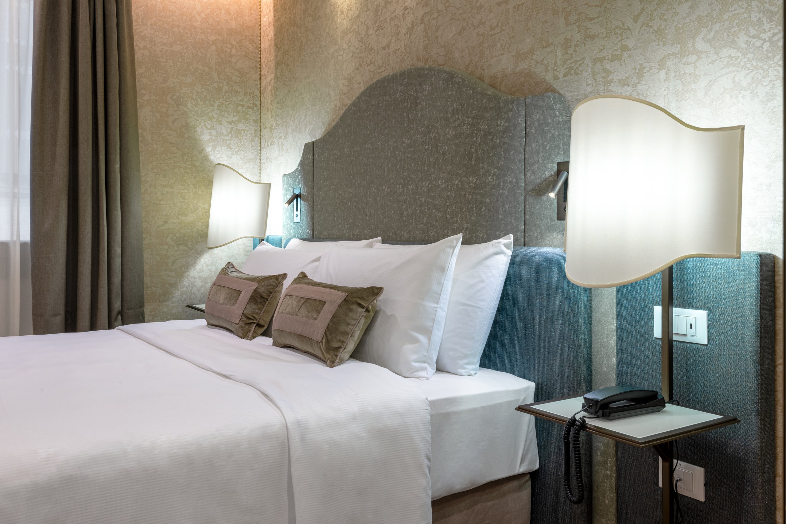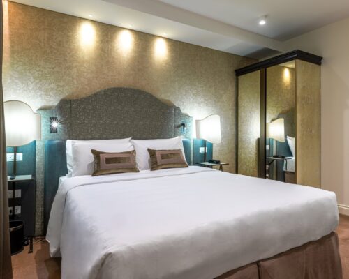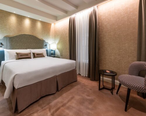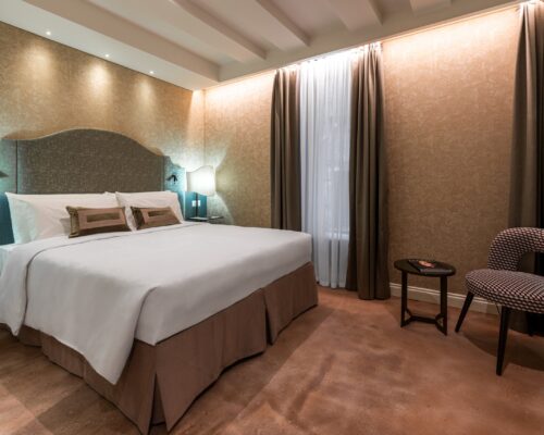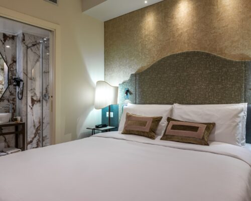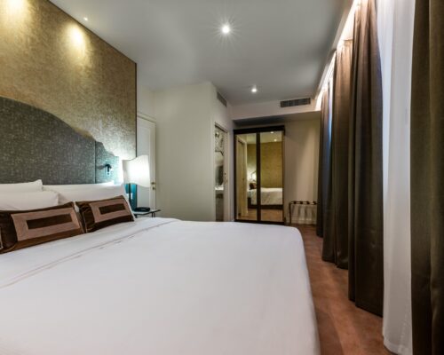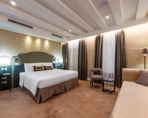 La nostra camera matrimoniale Superior, arredata in elegante stile liberty veneziano, offre un ambiente ampio e lussuoso. È dotata di aria condizionata, TV, minibar e bagno privato per garantire il massimo comfort durante il vostro soggiorno.