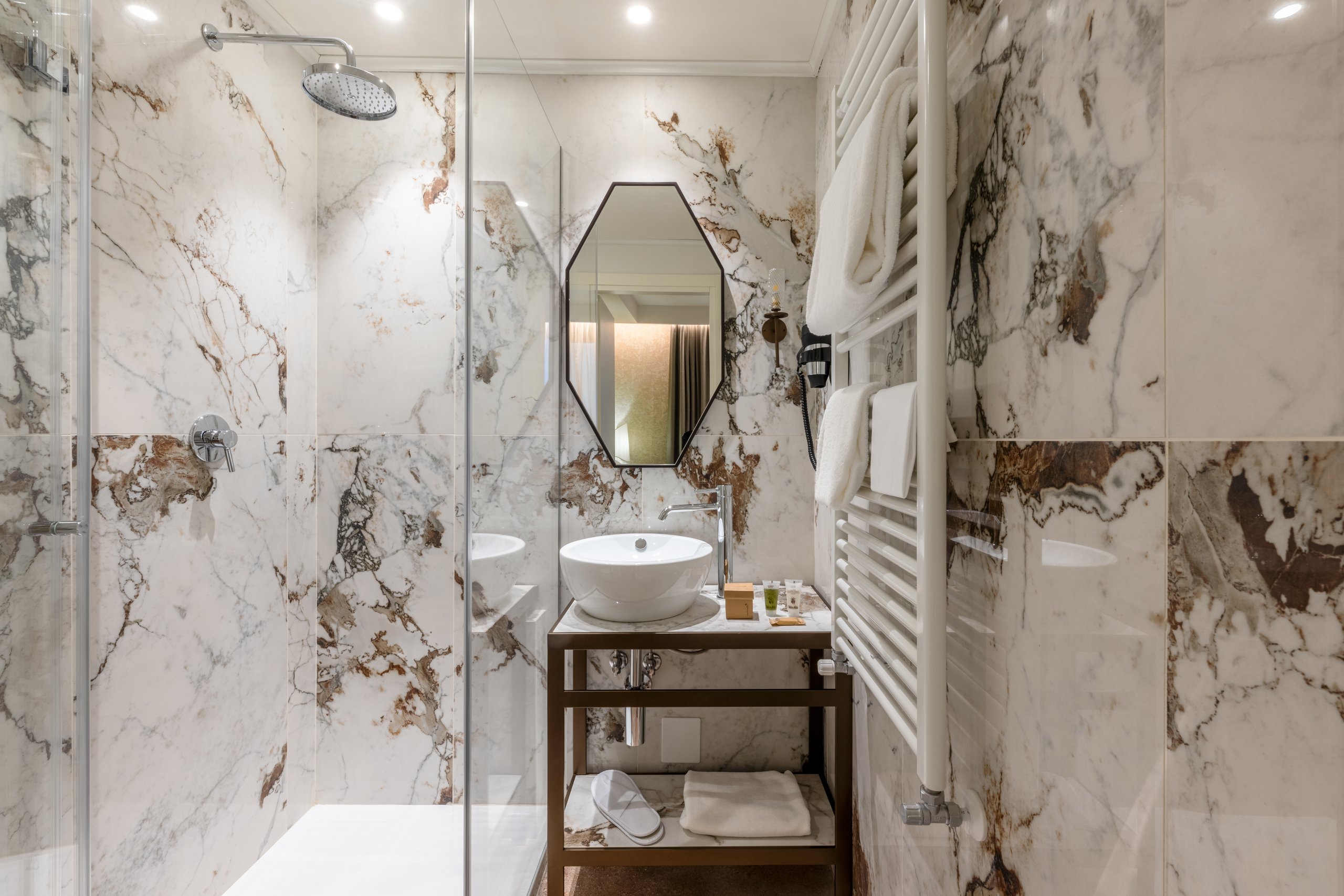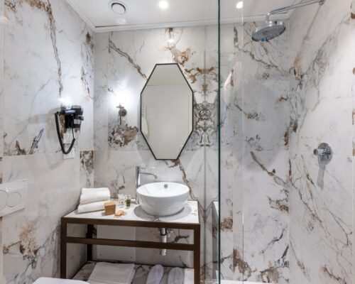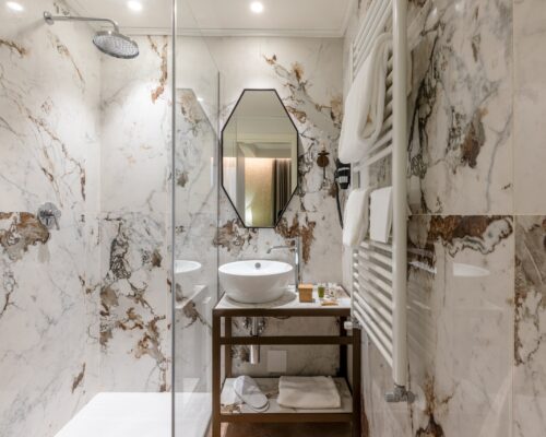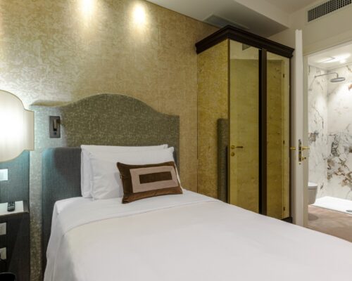 La nostra camera singola, arredata con eleganti dettagli in stile liberty veneziano, offre un ambiente accogliente e rifinito con cura. Dispone di bagno privato completo di set di cortesia, cabina doccia, bidet e asciugacapelli.